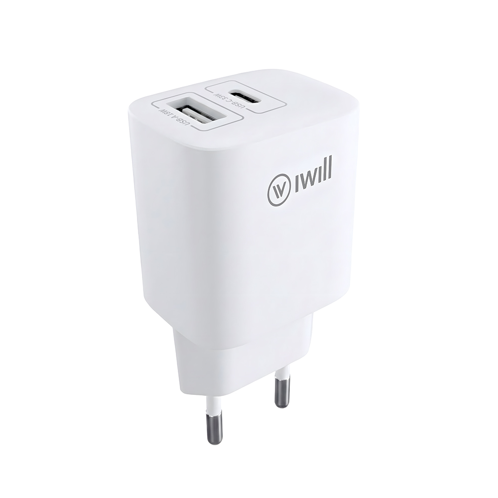 O Carregador 33W Essencial iWill entrega 33W de potência com USB-A + USB-C PD, ideal para o uso diário.